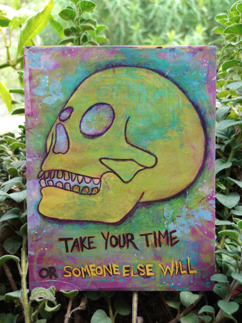This is a gelli monoprint made with acrylic paint, watercolor pencil and paint, color pencils, and nail polish featuring a skull illustration and the words “Take Your Time or Someone Else Will.”