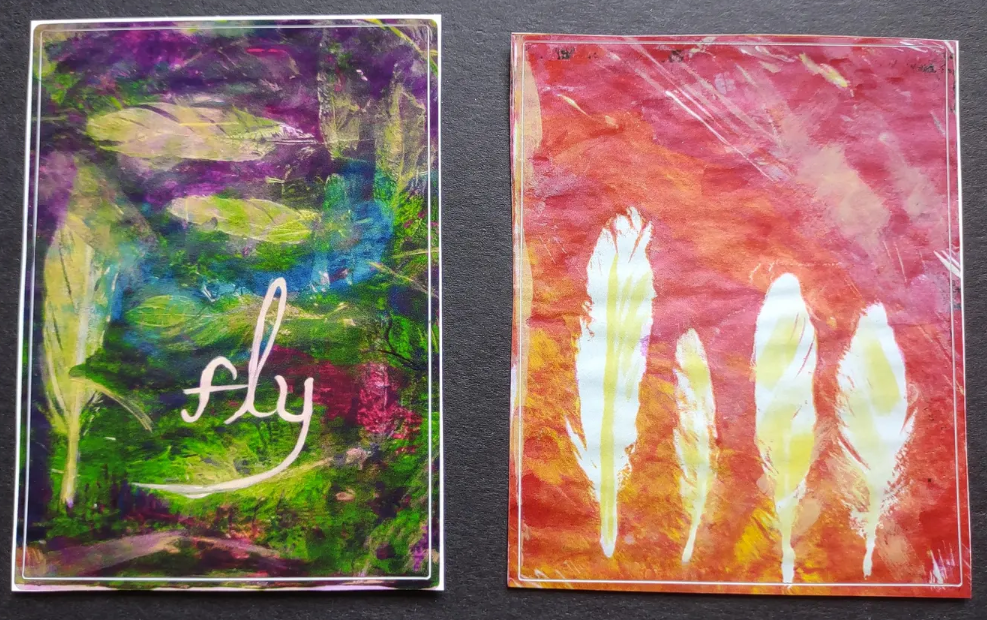These are two paired acrylic gelli monoprints featuring duck feathers and the word “fly.”